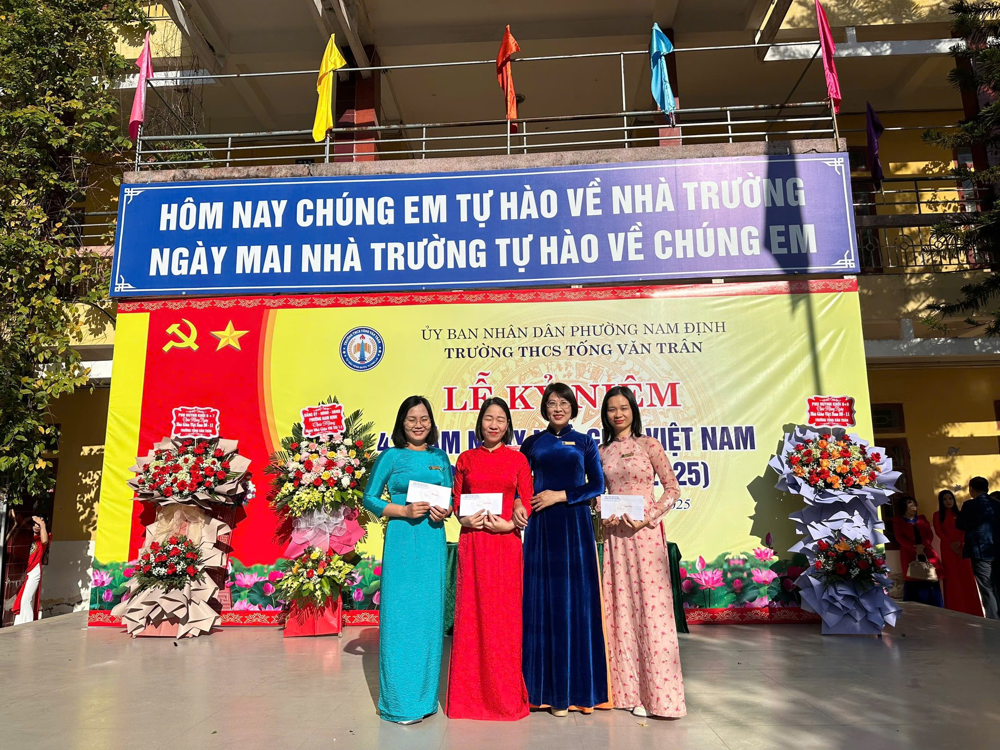 Chiều 19/11/2025 nhà trường vinh dự được đón đồng chí Phạm Hồng Thái – Phó Bí thư Đảng uỷ – Chủ tịch UBND phường Nam Định, đồng chí Trần Huy Tài – Chánh văn phòng HĐND – UBND, đồng chí Nguyễn Thế Lâm – Trưởng phòng VHXH về tặng hoa động viên, chúc mừng nhà trường.